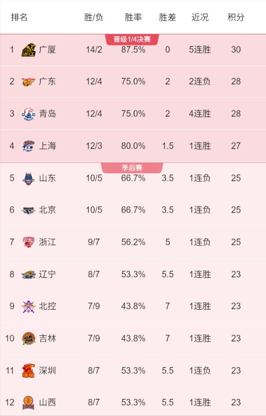 聯賽積分榜前12名排名:廣廈、廣東、青島、上海、山東、北京、浙江、遼寧、北控、吉林、深圳和山西。