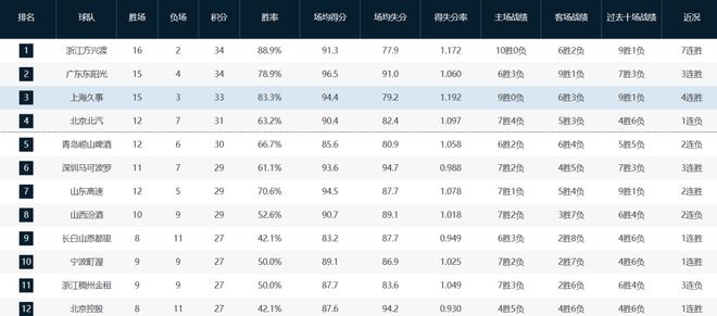 迄今為止,戰績排在北京隊前面的隊伍,分別是衛冕冠軍廣廈隊(16-2)、廣東隊(15-4)和上海隊(15-3)。